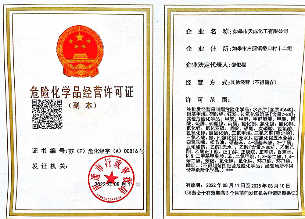 ?      如皋市天成化工有限公司創(chuàng)建于1996年。公司地處于美麗富饒的長江三角洲,座落在古鎮(zhèn)林梓,通揚(yáng)運(yùn)河河畔。南瀕長江、西臨204國道,距南通港、飛機(jī)場30公里,立體交通發(fā)達(dá)。公司經(jīng)營管理規(guī)范,技術(shù)力量雄厚,擁有一批高、中級專業(yè)技術(shù)人才。   公司主要產(chǎn)品為:無水四氯化錫、結(jié)晶四氯化錫、氯化亞錫、三氯乙酸、甲酸銨、苯甲酸銨、對硝基苯酚、對硝基苯甲酸、苯乙醛、癸醛、防腐劑等。產(chǎn)品品質(zhì)優(yōu)異、價格合理,主要銷往北京、上海、廣州、福州、安徽、江西等省市,并出口歐美、東南亞等國家和地區(qū),一直深受廣大新、老用戶的好評。   公司連年被評為“重合同守信用企...[更多內(nèi)容]